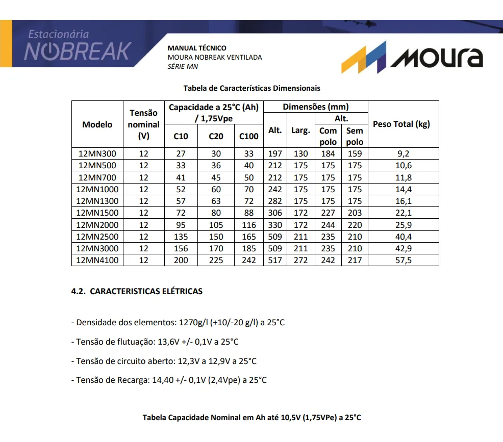 Especificações Técnicas – Bateria Estacionária Moura Nobreak 170Ah – Cód:12MN175