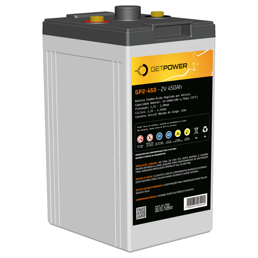 A Bateria Chumbo-Ácida Estacionária VRLA da Série Getpower GP 2-450, uma solução de energia confiável e de alta performance para uma variedade de aplicações. Equipada com a avançada tecnologia AGM (Absorbed Glass Mat), esta bateria se destaca por seu eletrólito absorvido em manta de microfibra de vidro, oferecendo uma operação segura e eficiente, regulada por válvula (VRLA – Valve Regulated Lead Acid). Com uma eficiência de recombinação de gases superior a 99%, a Bateria Getpower GP/AGM-2V redefine os padrões de eficiência e confiabilidade.